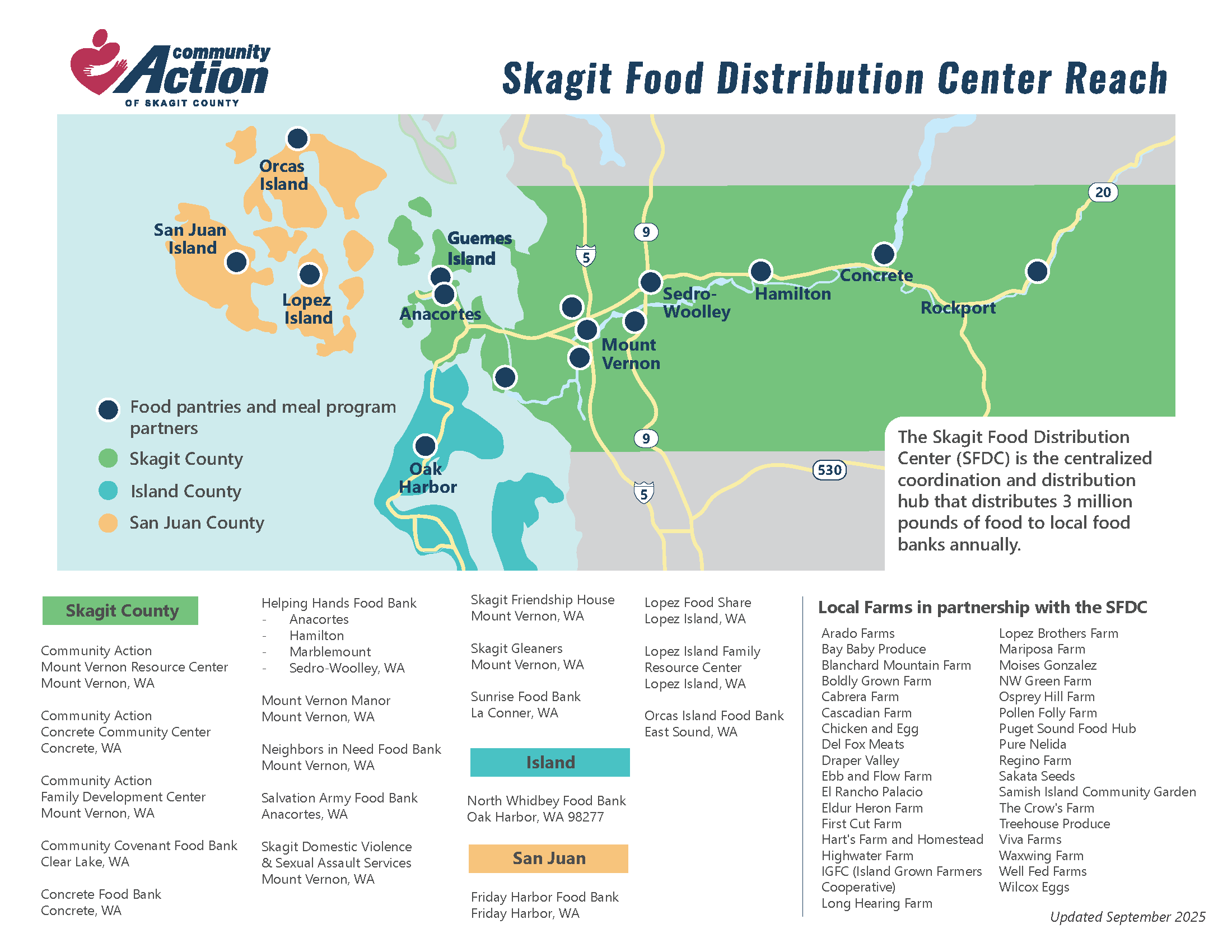 The Skagit Food Distribution Center, a partnership between Skagit County and Community Action, was established in 2006 as our county’s first ever centralized Food Bank Distribution Center. The centralized warehouse allows the county’s food pantries and hot meal programs to effectively work as partners, streamlining services, saving time and money – and it promises to yield more food for our county’s hungriest families.